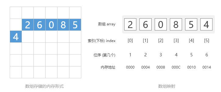 数组中的元素存储在连续的内存位置中,并由一个索引(也称为下标)引用。下标是一个用于标识数组中的元素位置的序号。