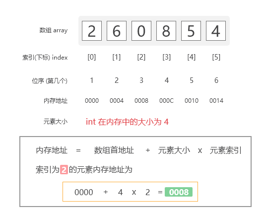 一个int类型的大小在内存中为4bytes。由于数组将其所有数据元素存储在连续的存储器位置中, 因此只需要知道数组首地址,即数组中第一个元素的地址就可以计算出该数组中其他元素的内存地址。